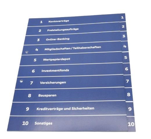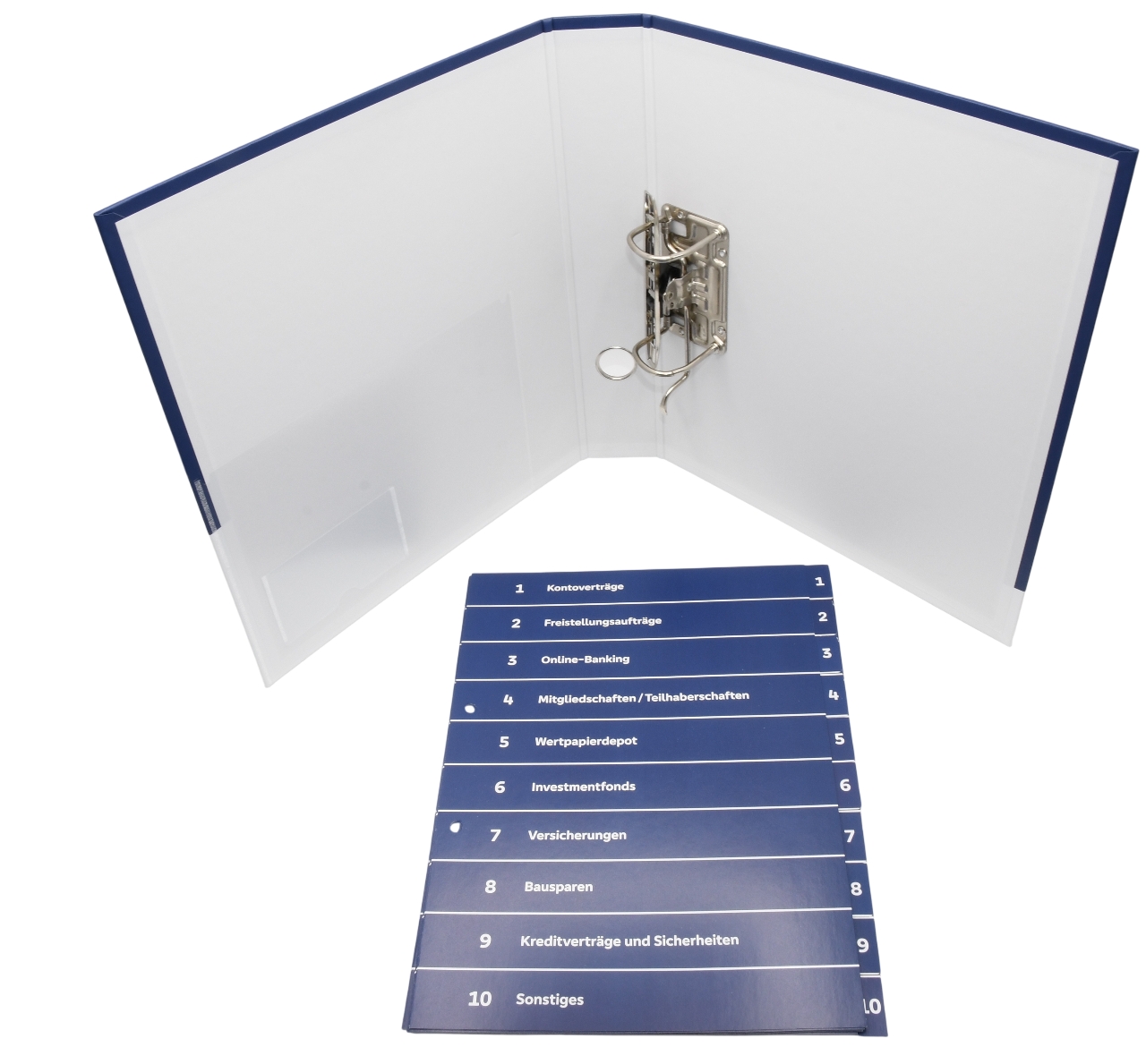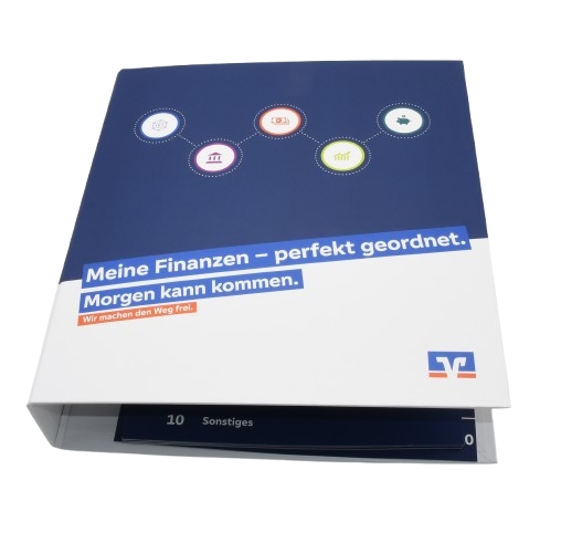 Sie suchen ewig bis Sie Ihre Unterlagen zusammen haben? Damit ist jetzt Schluss. Mit dem Dokumenten-Ordner im neuen Kampagnenlayout bekommen Sie die Ablage Ihrer Bankunterlagen und alles was dazu gehört, perfekt in den Griff. Das Register sorgt für eine klare Struktur, die das Banking und Planen enorm vereinfacht. Der Ordner hat eine Rückenbreite von ca.56 mm und eine Füllhöhe von 30 mm. Somit können Sie alle wichtigen Dokumente aufnehmen. Zudem verfügt der Ordner über ein praktisches Griffloch und einer aufgeschweißten Visitenkartentasche auf der Innenseite.